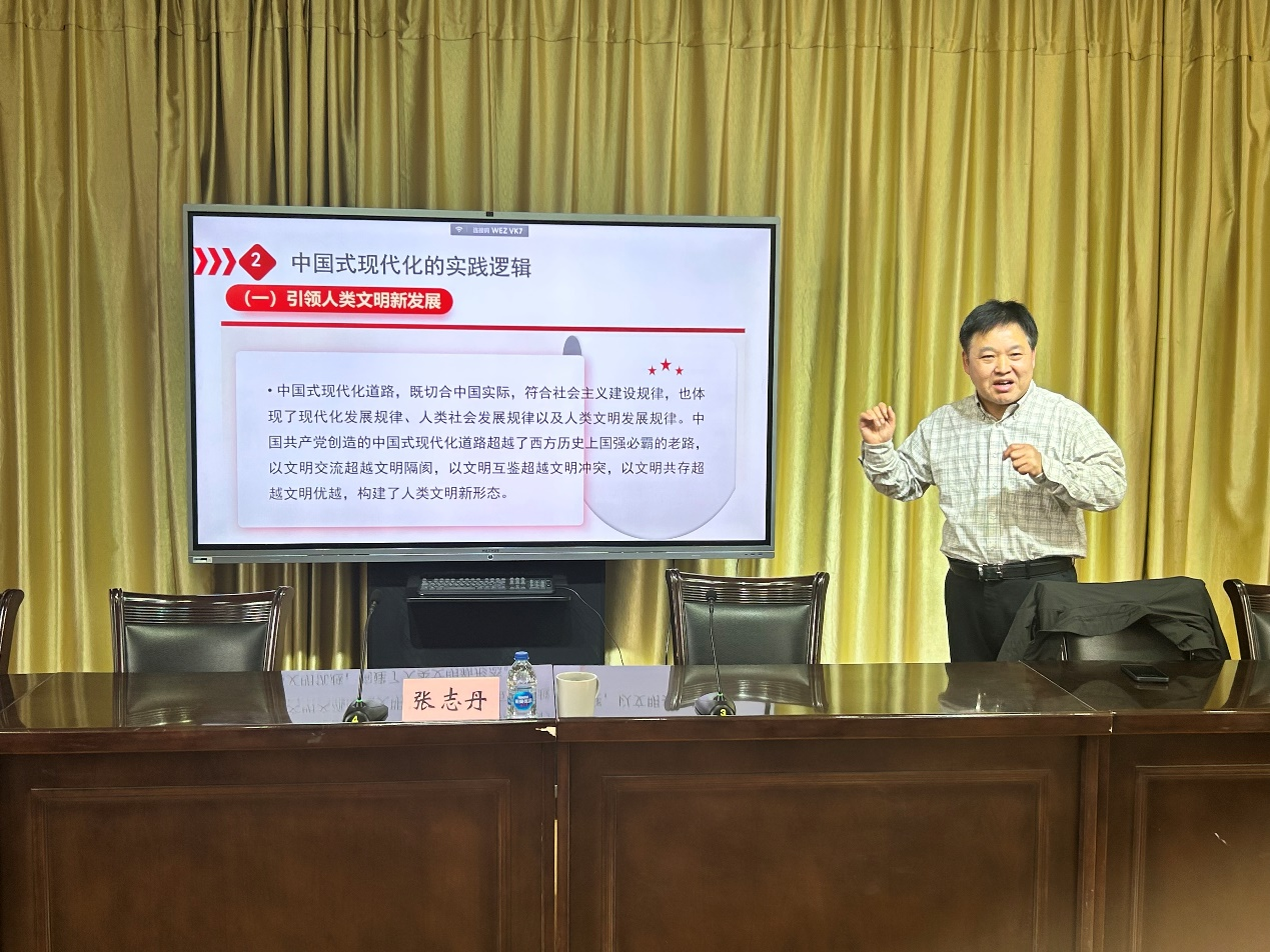 讲座上,张志丹教授先后就推进中国式现代化的核心要义、推进中国式现代化的基本特征以及推进中国式现代化的三重逻辑作了深刻阐释与解读。他强调,中国式现代化是人口规模巨大的现代化,是全体人民共同富裕的现代化,是物质文明和精神文明相协调的现代化,是人与自然和谐共生的现代化,是走和平发展道路的现代化。在当下百年未有之大变局,社会主义的发展使我们产生了不可逆转的“新”变化,应逐步推进转型升级,实现高质量发展。我们应增强做中国人的底气、骨气、志气,坚持对待历史的客观态度、坚持真理的巨大勇气以及走向未来的坚定信心。